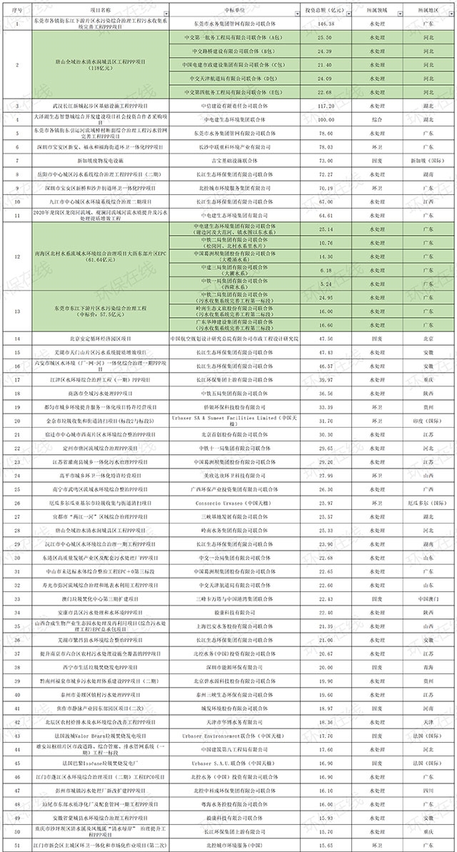 本文整理了2020年289項(xiàng)億元以上的中標(biāo)項(xiàng)目,投資總額達(dá)到3161.79億元。 其中,超過百億的中標(biāo)項(xiàng)目有4個,分別為東莞市各鎮(zhèn)街東江下游片區(qū)水污染綜合治理工程污水收集系統(tǒng)完善工程PPP項(xiàng)目(146.38億元)、唐山全域治水清水潤城縣區(qū)工程PPP項(xiàng)目(5個標(biāo)段共計(jì)118億元)、武漢長江新城起步區(qū)基...