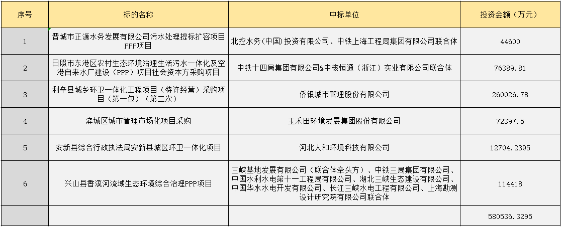 2021年1月以來,環(huán)保領(lǐng)域有不少大標(biāo)落地,本文梳理了6個中標(biāo)項目,總投資額超58億元。值得注意的是,水環(huán)境項目標(biāo)的一如既往是大標(biāo)的常見落腳點,而本次6個標(biāo)的有超過59%的投資額由環(huán)衛(wèi)貢獻,尤其是利辛縣城鄉(xiāng)環(huán)衛(wèi)一體化工程項目(特許經(jīng)營)采購項目,26年的投資總額將超過26億元。 晉城市正源水務(wù)發(fā)展有...