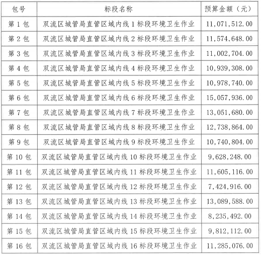 成都市雙流區(qū)城市管理局擬對“成都市雙流區(qū)城市管理局直管區(qū)域(內(nèi)線)環(huán)衛(wèi)作業(yè)采購項目”進行采購。據(jù)了解,此輪采購將直管公廁管理和直管區(qū)域生活垃圾前端清運與環(huán)衛(wèi)清掃保潔作業(yè)一并服務外包。 服務共分為16個標段,擬通過公開招標方式確定16名中標人提供環(huán)衛(wèi)作業(yè)相關服務。項目總預算為1...