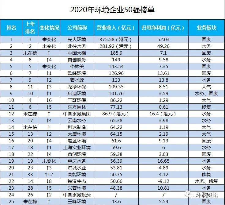 2020中國環(huán)境企業(yè)50強(qiáng)榜單,是在對上規(guī)模環(huán)境企業(yè)調(diào)研的基礎(chǔ)上,根據(jù)各企業(yè)2019年度營業(yè)收入總額,按降序排列產(chǎn)生。其中,以環(huán)境污染治理為主營業(yè)務(wù)的上市公司,按照已公布的2019年報(bào)數(shù)據(jù);非上市公司實(shí)行企業(yè)自愿申報(bào)制,以企業(yè)提供的由第三方出具的財(cái)務(wù)審計(jì)報(bào)告數(shù)據(jù)為準(zhǔn)。從結(jié)構(gòu)來看,本年度登榜的50強(qiáng)企...