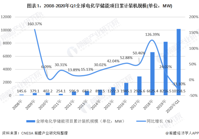 根據(jù)CNESA的數(shù)據(jù)顯示,2018年全球電化學(xué)儲能累計(jì)裝機(jī)容量6.63GW,同比增長126.39%;2013-2018年的年復(fù)合增長率高達(dá)113.86%。截止2019年,全球電化學(xué)儲能累計(jì)裝機(jī)容量8.2GW,同比增長24.02%,受中國市場影響,新增裝機(jī)規(guī)模下降,為1.59GW。雖然2019年中國儲...