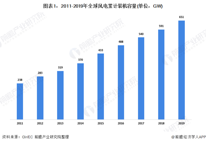 全球風(fēng)電規(guī)模增長迅速 風(fēng)力發(fā)電是可再生能源領(lǐng)域中最成熟、最具規(guī)模開發(fā)條件和商業(yè)化發(fā)展前景的發(fā)電方式之一,且可利用的風(fēng)能在全球范圍內(nèi)分布廣泛、儲量巨大。同時(shí),隨著風(fēng)電相關(guān)技術(shù)不斷成熟、設(shè)備不斷升級,全球風(fēng)力發(fā)電行業(yè)高速發(fā)展。根據(jù)GWEC的統(tǒng)計(jì),截至2019年底,全球風(fēng)電累計(jì)裝機(jī)容量為651GW,較20...