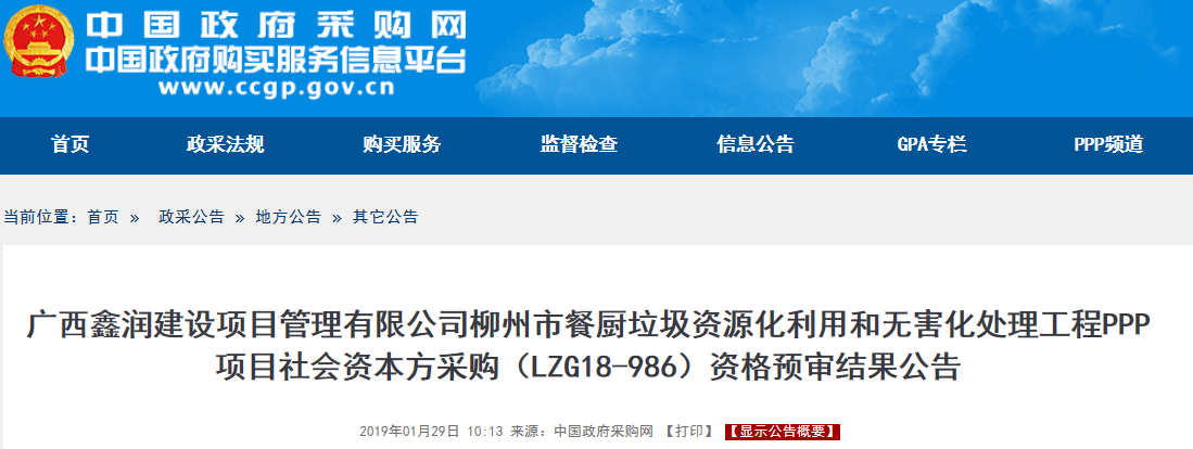 廣西鑫潤(rùn)建設(shè)項(xiàng)目管理有限公司受柳州市市容管理局 委托,根據(jù)《中華人民共和國(guó)政府采購(gòu)法》等有關(guān)規(guī)定,現(xiàn)對(duì)廣西鑫潤(rùn)建設(shè)項(xiàng)目管理有限公司柳州市餐廚垃圾資源化利用和無(wú)害化處理工程PPP項(xiàng)目社會(huì)資本方采購(gòu)(LZG18-986)資格預(yù)審公告進(jìn)行其他招標(biāo),歡迎合格的供應(yīng)商前來(lái)投標(biāo)。項(xiàng)目名稱:廣西鑫潤(rùn)建設(shè)項(xiàng)目管理有...